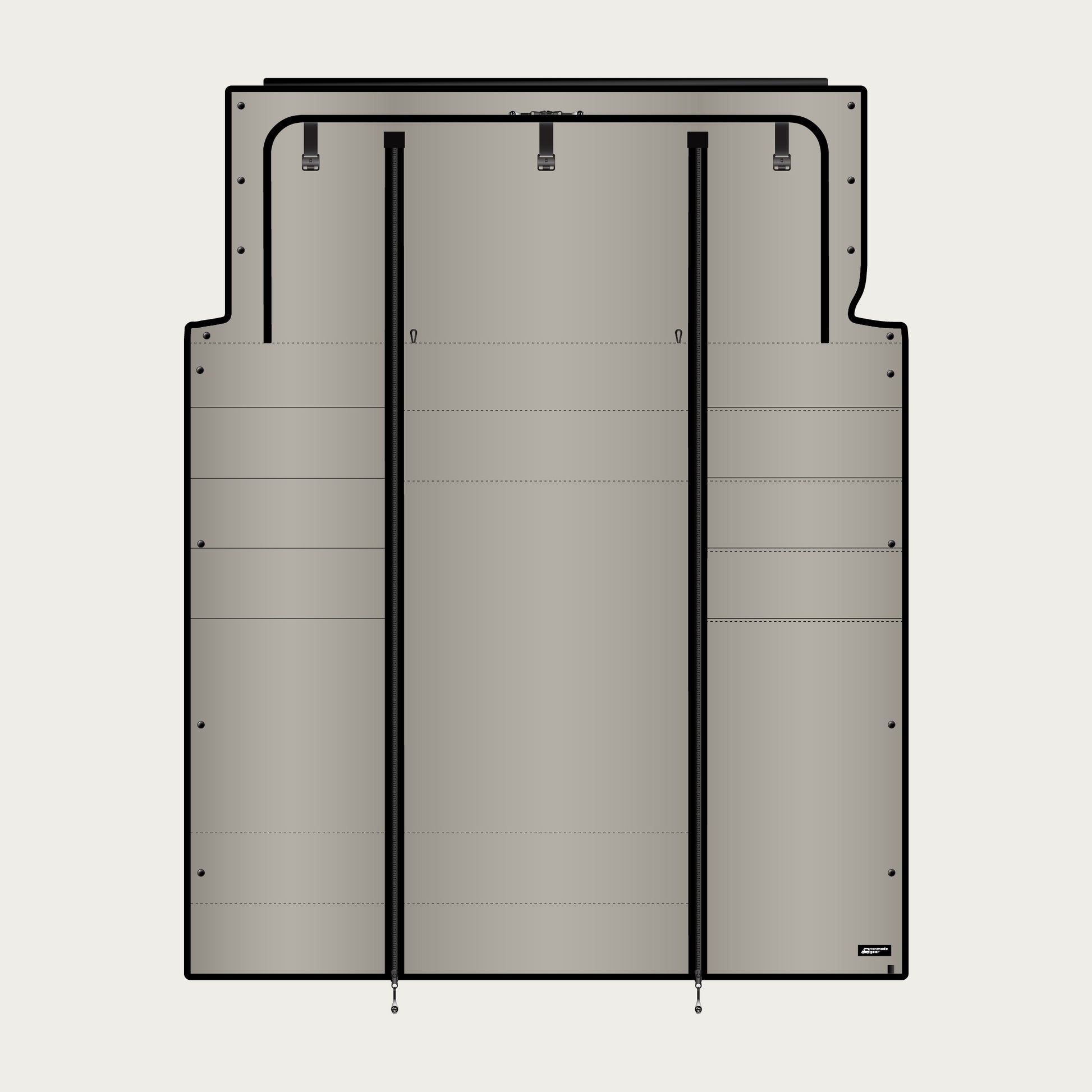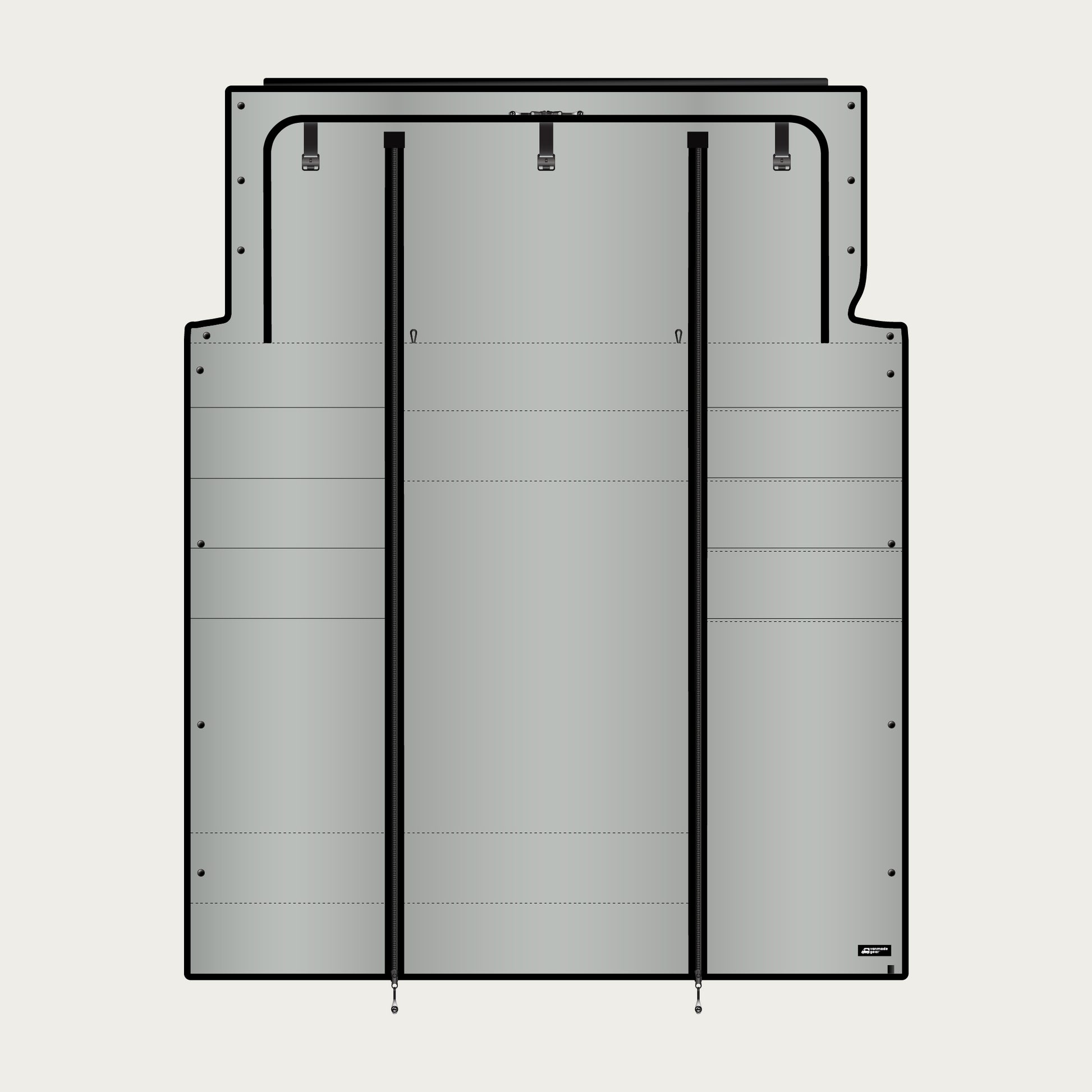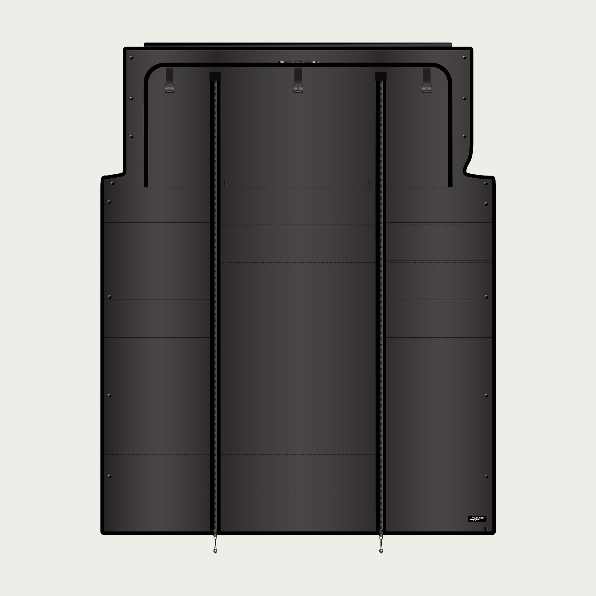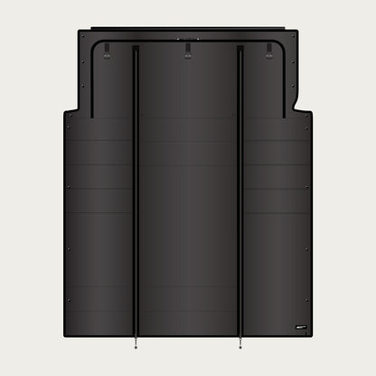 Three-panel cab partition designed specifically for the Transit Winnebago Ekko. This upgraded, fully blackout, and insulated solution replaces the original curtain and stays installed—rolling up neatly when not in use while preserving full headroom, swivel seat access, and even TV access! It creates full black-out privacy, enhances temperature regulation, and reduces interior noise for a more comfortable and efficient van experience.